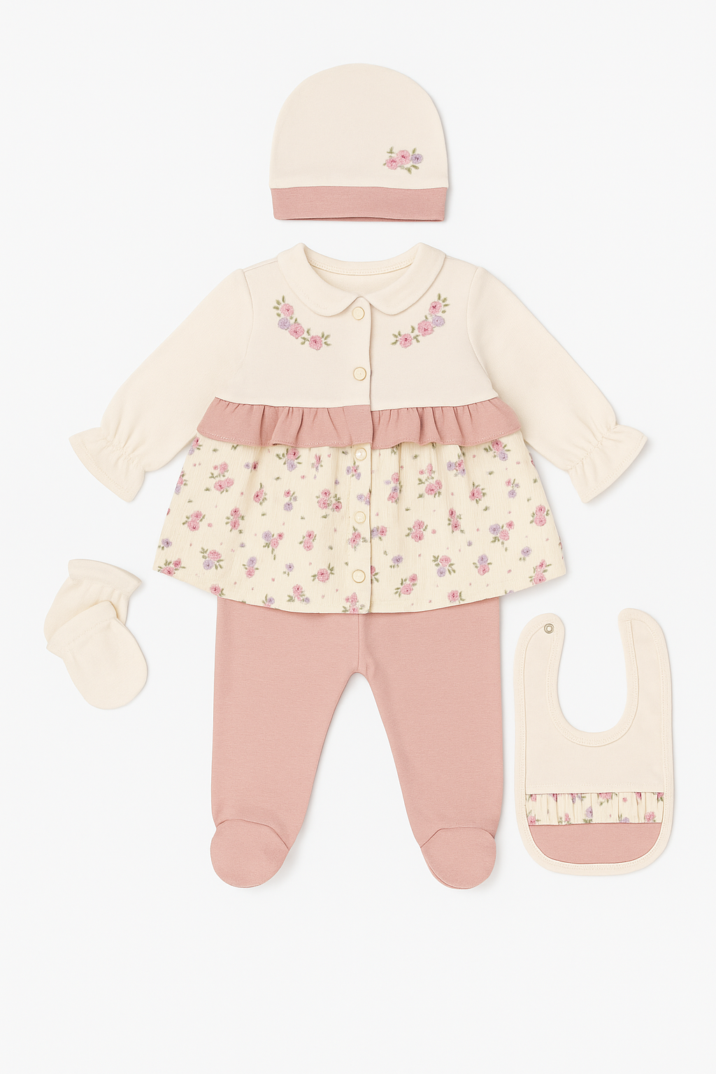 Deze schattige set bestaat uit een comfortabele footed onesie broekje, een bijpassend stijlvol vestje en een bijpassend mutsje, een zacht slabbetje en lieve wantjes. De crème basis wordt gecombineerd met moderne blush-pink accenten en een speels bloemenpatroon, waardoor de set zowel tijdloos als fris oogt.
