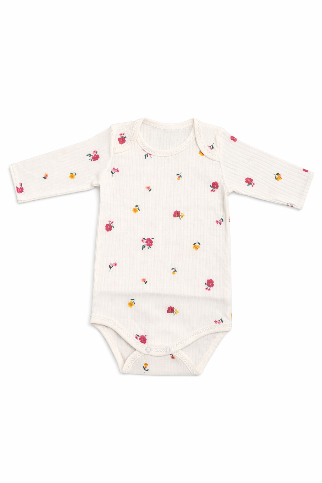 Deze schattige babyromper is gemaakt van zachte, ribgebreide stof en biedt optimaal comfort voor je kleintje. De off-white kleur wordt verfijnd aangevuld met een lieve bloemenprint in roze, geel en groen, wat zorgt voor een tijdloze en frisse uitstraling. Dankzij de lange mouwen is de romper perfect voor koelere dagen.