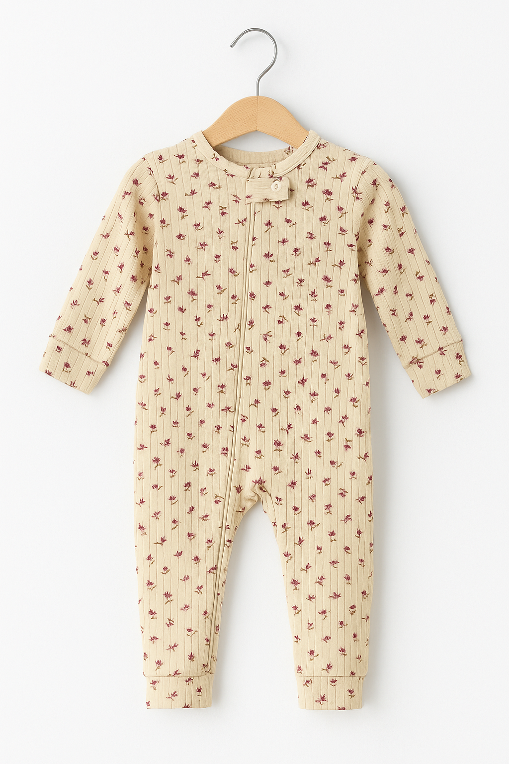 De Mini Blossom Onesie is het perfecte pakje voor kleine dromers. Gemaakt van ultrazachte, ademende ribstof biedt dit rompertje optimaal comfort voor dagelijks gebruik. Het subtiele beige design wordt versierd met fijne bloemetjes in warme tinten, waardoor het een tijdloze en lieve uitstraling krijgt.