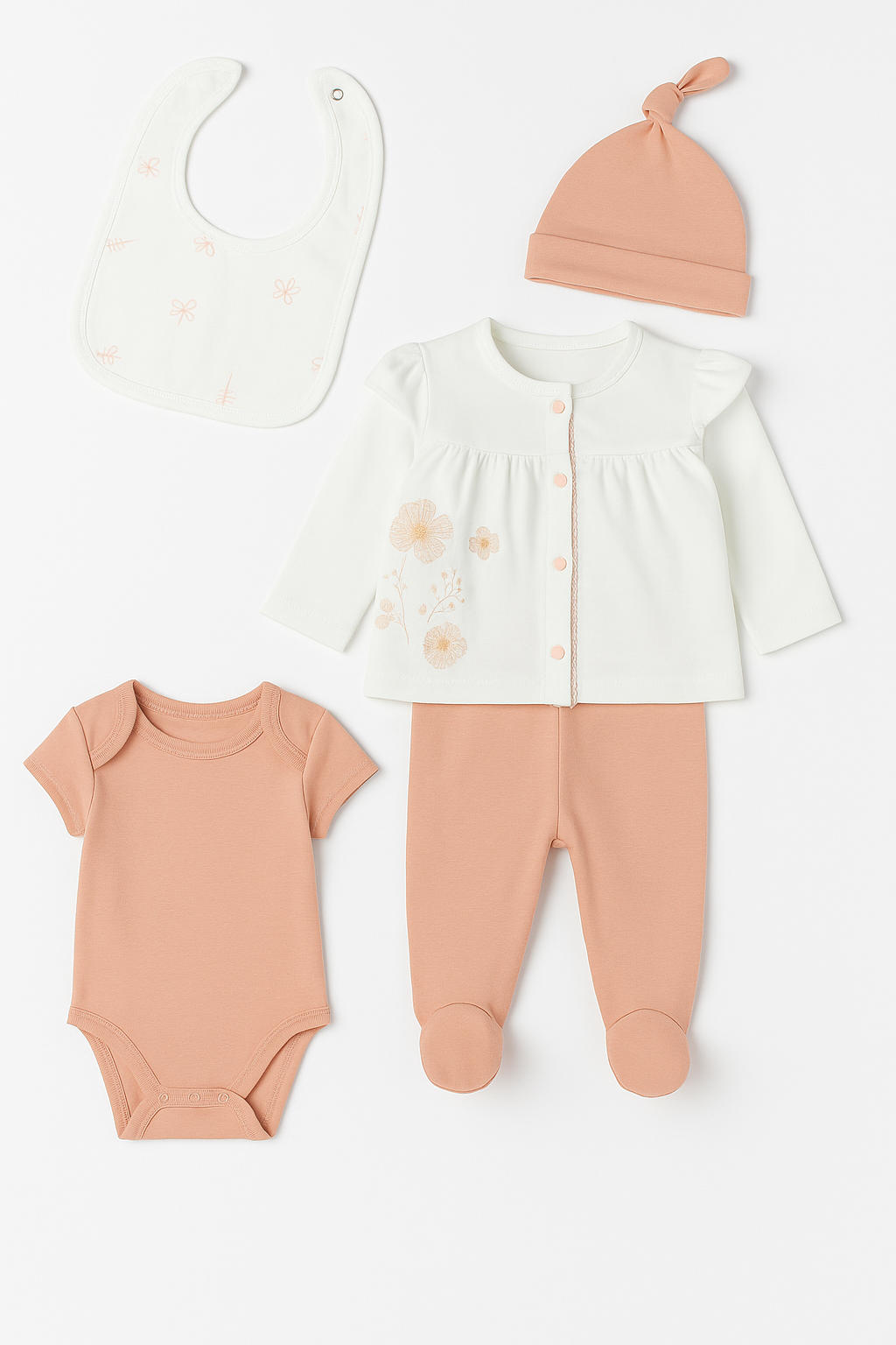 Deze prachtige newbornset bestaat uit een comfortabel rompertje, een footed broekje, een zacht vestje en een mutsje en een lief vestje met subtiele bloembroderie. De warme perzikroze tinten gecombineerd met fris wit geven de set een rustige en elegante uitstraling—perfect voor zowel dagelijks gebruik als een bijzonder moment.