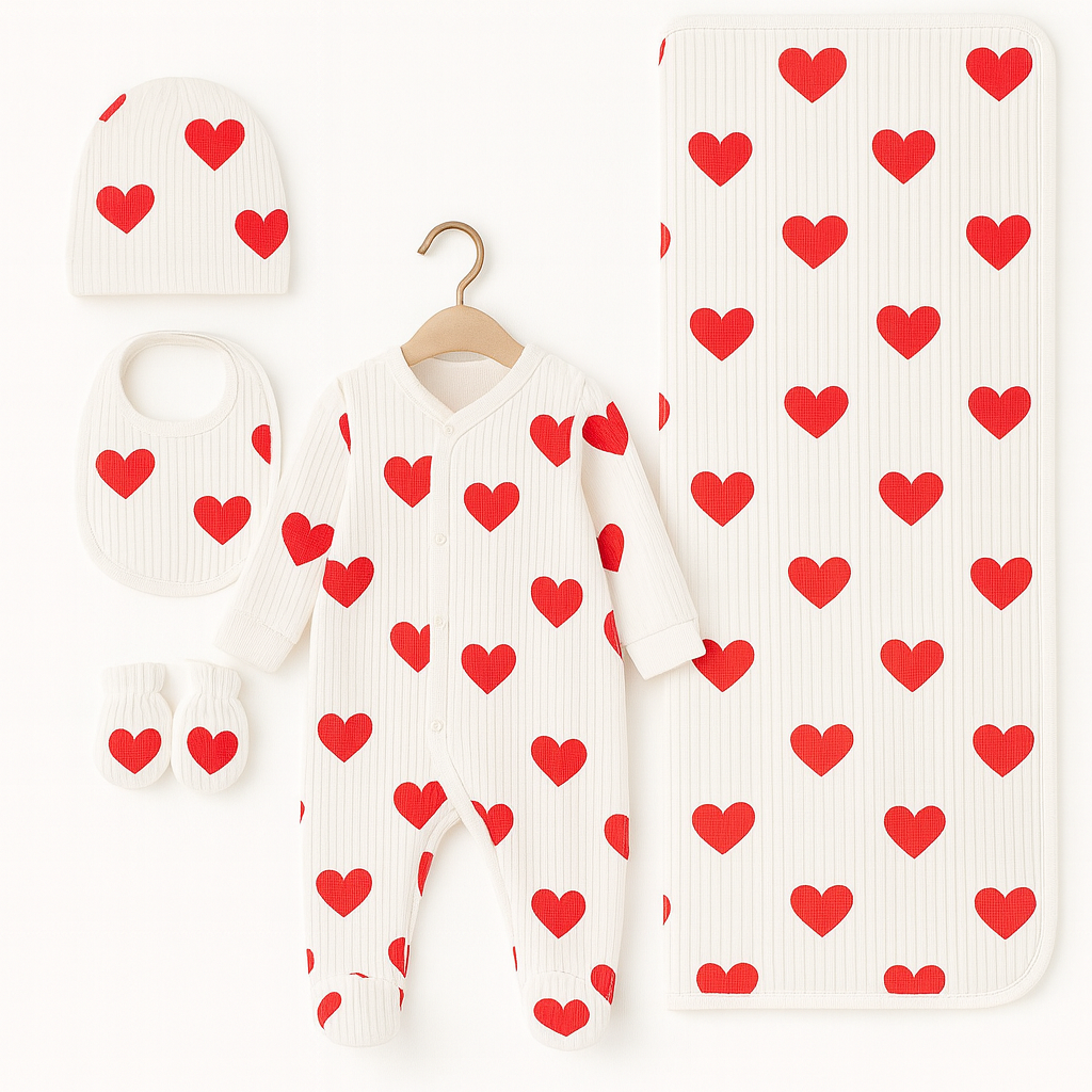De Sweet Heart Newborn Set is een complete en schattige outfit-set voor je pasgeborene — ontworpen om zacht, comfortabel én praktisch te zijn. De set is gemaakt van ademend katoen met ribbelstructuur en heeft een vrolijk wit-rood hartjes-design dat liefde en knusheid uitstraalt. Perfect voor dagelijks gebruik, of als lief kraamcadeau.